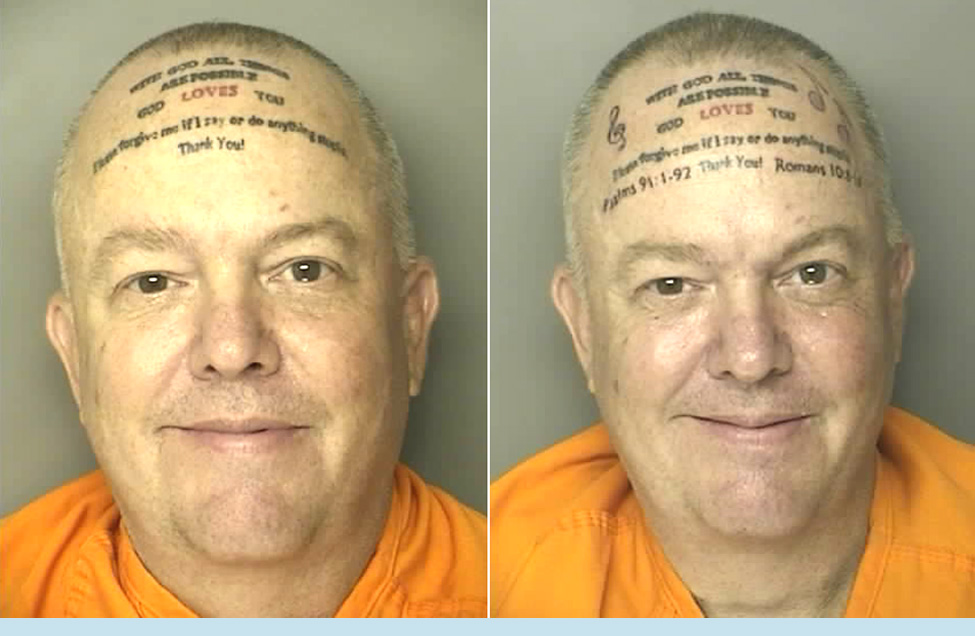 The Smoking Gun is a good place to troll for chronically single—and recently single—people. I stumbled across a series of mug shots with a particular type of tattoo. A tattoo can be sexy. It says, "I'm tough and a little bit of a badass." Now, a FOREHEAD tattoo says, "I'm tough with a hint of completely and utterly deranged." Check out this fine specimen.